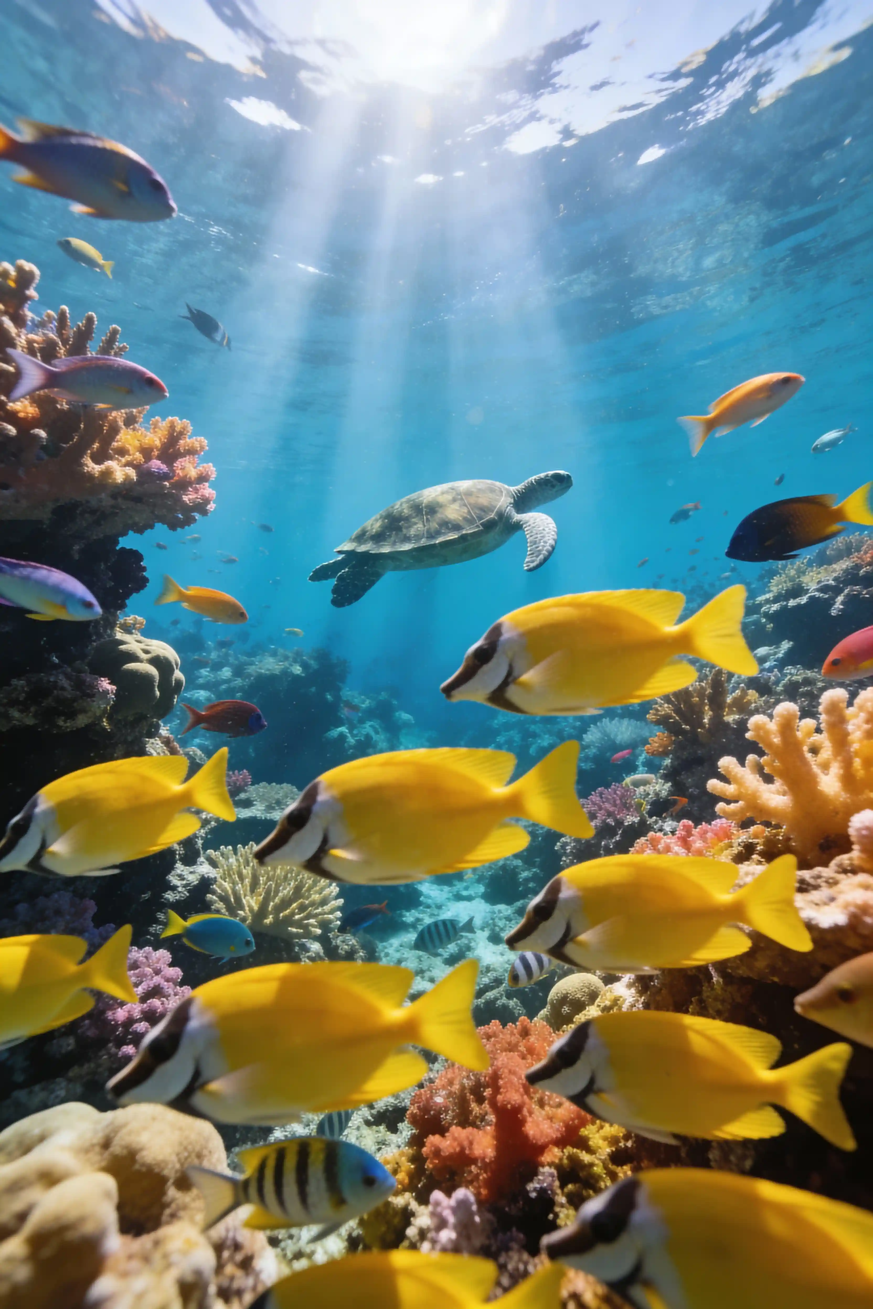 Colorful coral reef teeming with tropical fish, shafts of sunlight penetrating clear blue water, sea turtle swimming in mid-distance, school of yellow fish in foreground, underwater photography, wide-angle perspective, National Geographic style