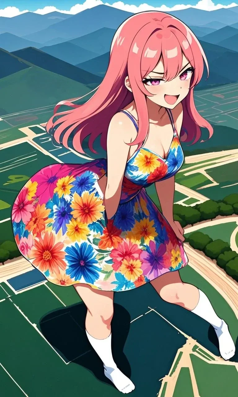 géante, Gigantic, dominant les montagnes, tout en courbes, voluptueux, gros seins, cuisses épaisses, fesses courbées, Seul, 1 fille, longs cheveux roses, yeux roses, shorts roses, chaussettes blanches, rose, suffisant, arrogant, riant, raillerie, se penchant en avant, se pencher