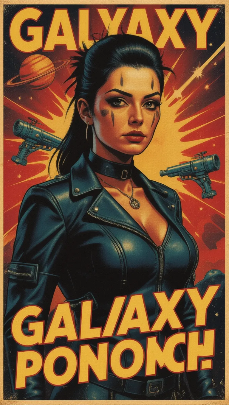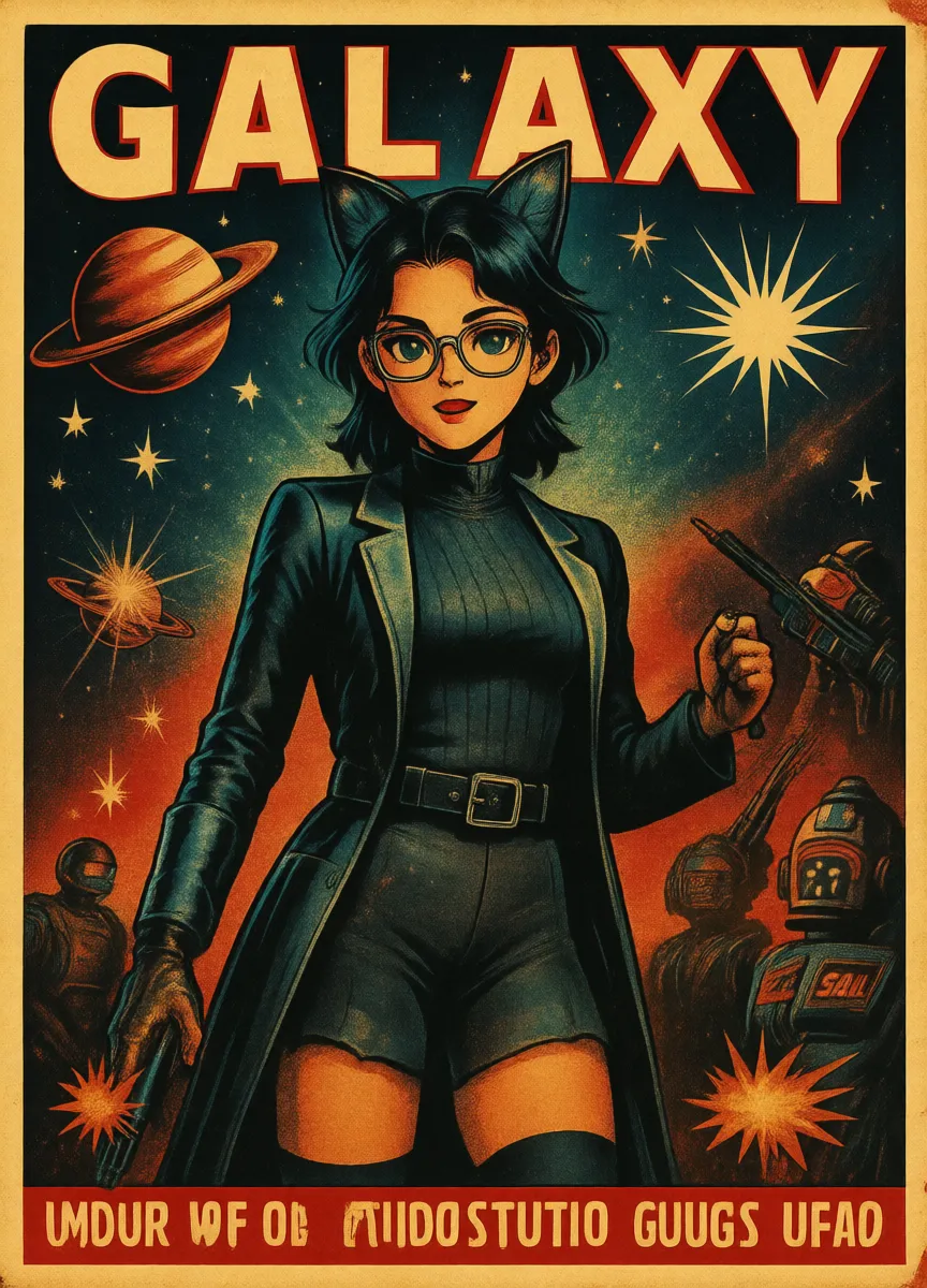 Transforme le portrait en une illustration de couverture de roman de science-fiction pulp des années 1950 ou 1970.