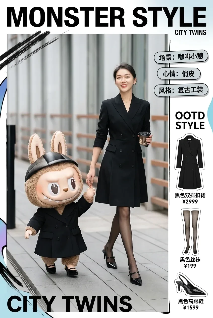 "MONSTER STYLE|트윈 룩"은 디지털 융합 기술을 통해 실제 모습과 전용 Monster 캐릭터를 스타일이 통일된 스트리트 패션 파트너로 만드는 것을 목표로 합니다. 이 콘텐츠는 하이엔드 패션 매거진의 스프레드, 소셜 미디어 OOTD 캠페인, 브랜드 콜라보레이션 Lookbook 및 AR 인터랙티브 경험에 적합하며, 개인의 스타일 표현을 강화하는 동시에 IP 캐릭터에 "미니 오트쿠튀르"의 생명력을 부여하여 패션 문맥 속에서 현실과 환상의 완벽한 공생을 실현합니다.