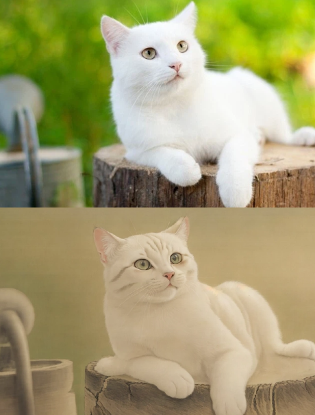 当现代遇见古风画卷特效,会产生怎样的美妙画卷,快用照片试试吧(用提示词描述动物的品种和花色,尤其是纯色的需要强调没有花纹)