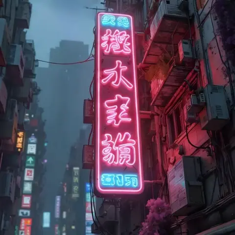 Post apocalyptic Kowloon inspired slum environment, glitching neon specialized, photorealism enhanced, moss and blooming walls.