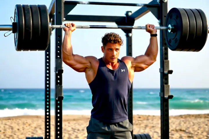 A massive barbell is lifted high, the steel bending under the weight.