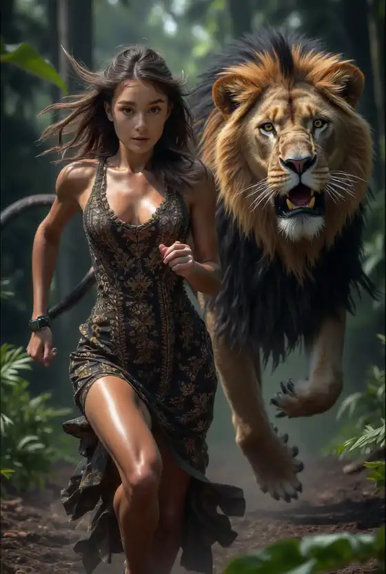 Create your own exclusive video of a beautiful woman being chased by a fierce beast with one click。