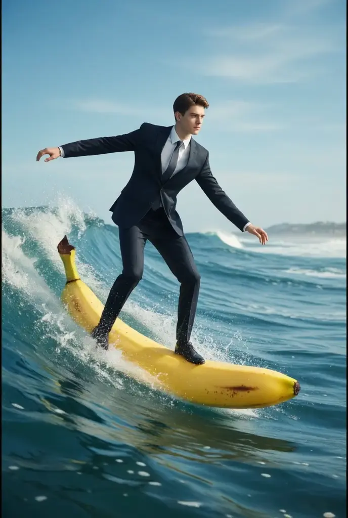 This app generates an image and video scene of a person riding a giant banana down a massive wave.