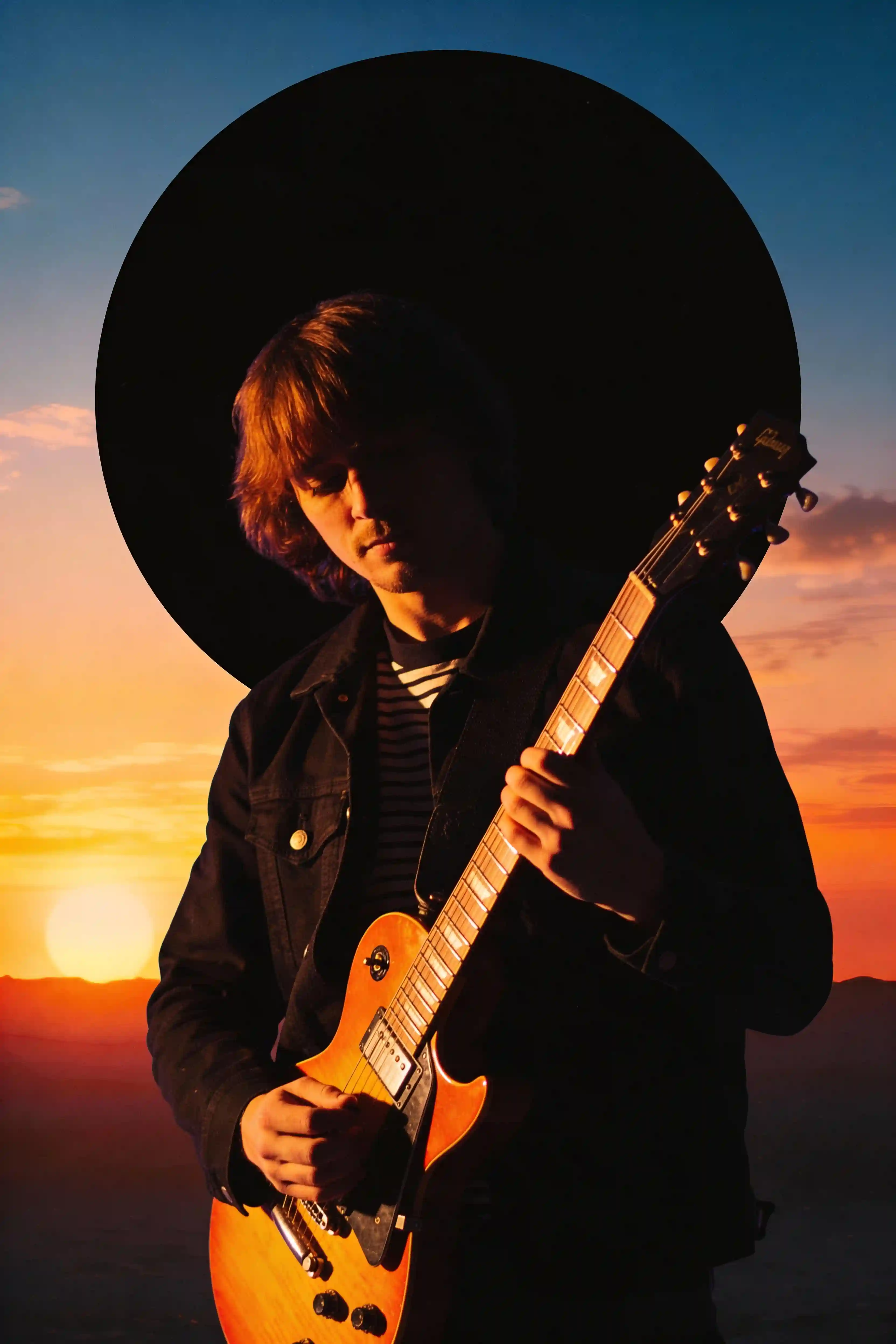 吉他手剪影,手持旭日纹电吉他,橙色背光勾勒出人物轮廓,黑色圆形背景搭配日落渐变色,80年代合成波风格