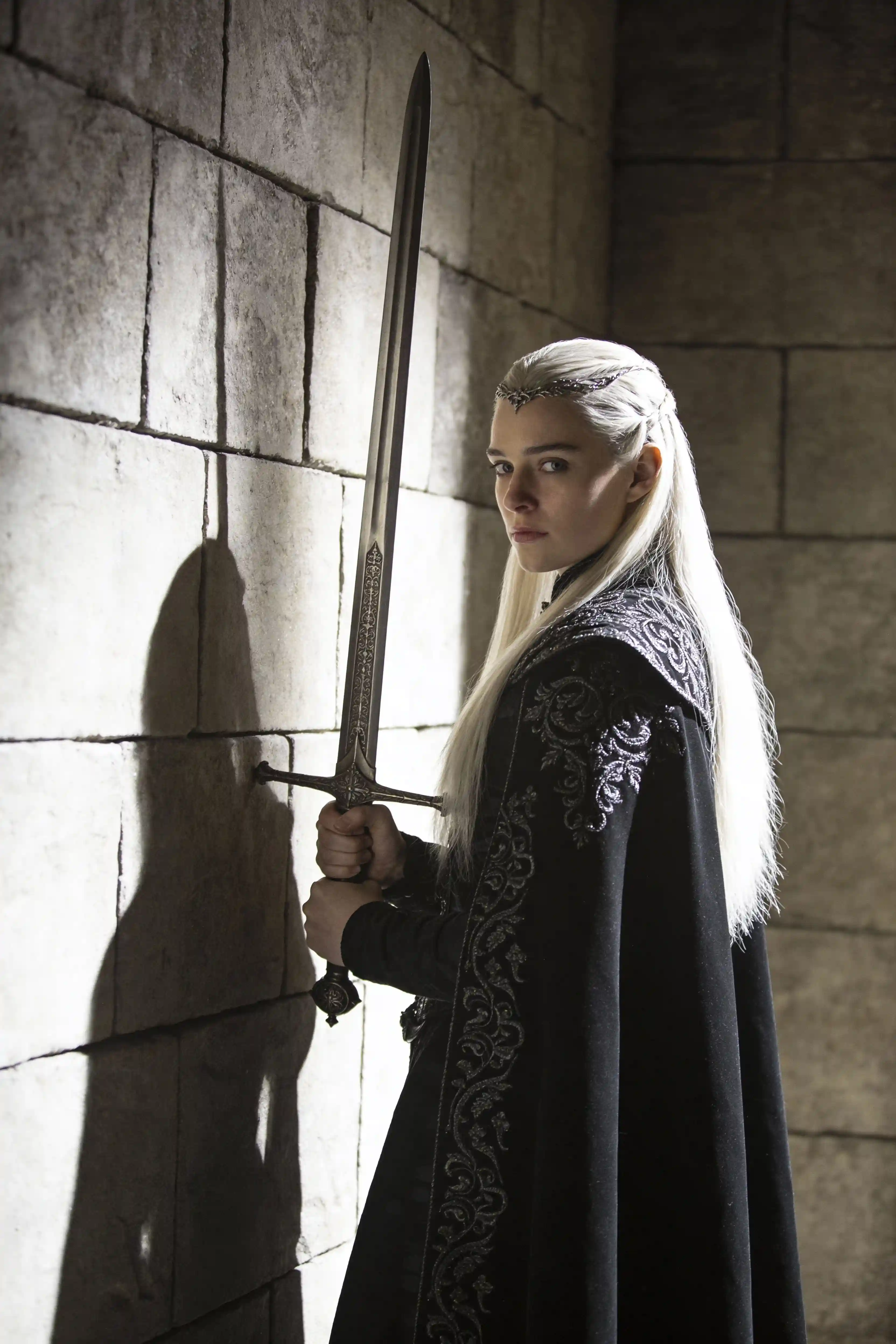 空灵人物,留着铂金色长发,身穿饰有华丽刺绣的优雅黑袍,双手持中世纪长剑,戏剧性侧光照在纹理石墙上,奇幻战士美学,电影感景深,阴郁氛围
