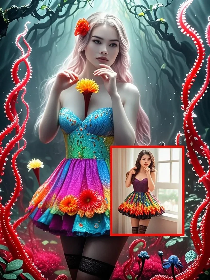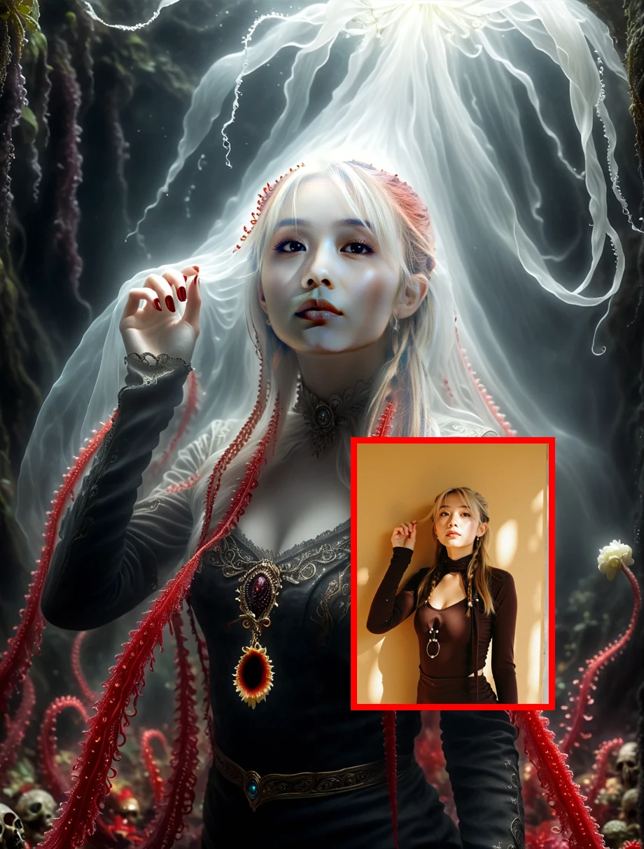 Dark Flower Ghost 是黑暗幻想艺术流派 , 具有神秘和超现实的风格 . 它结合了现实和想象的元素 , ,具有柔和的发光光 , 奇异的红色触角 , 以及纯白色和醒目的红色之间的对比等特征.